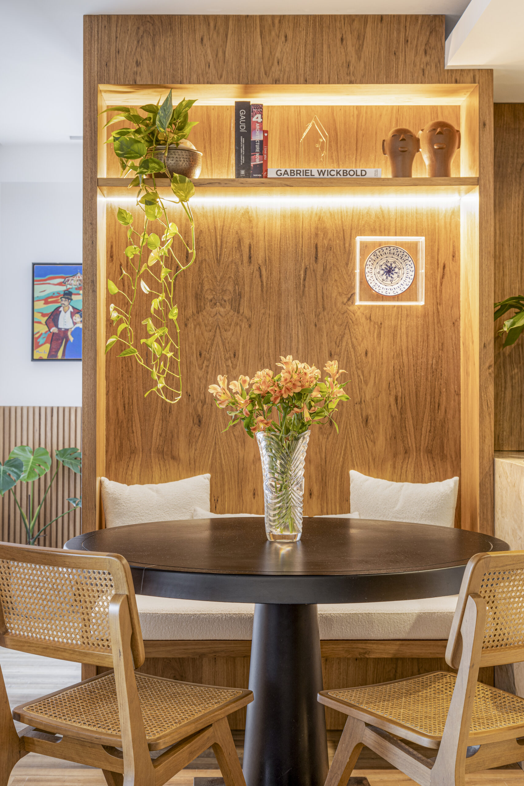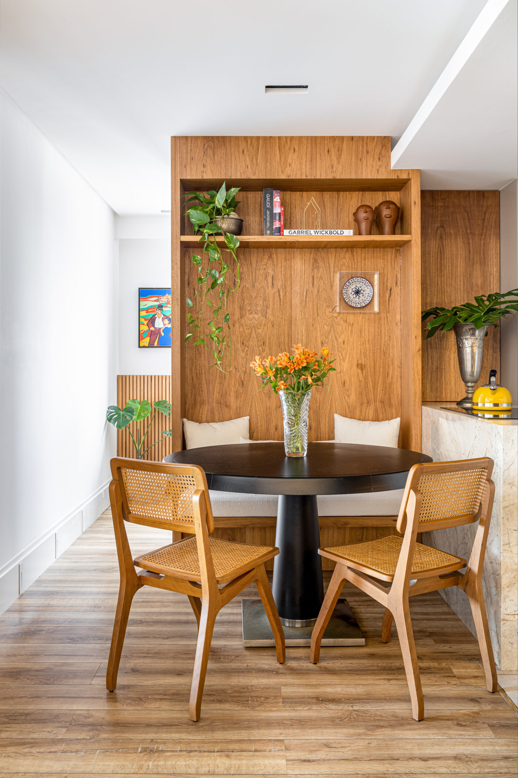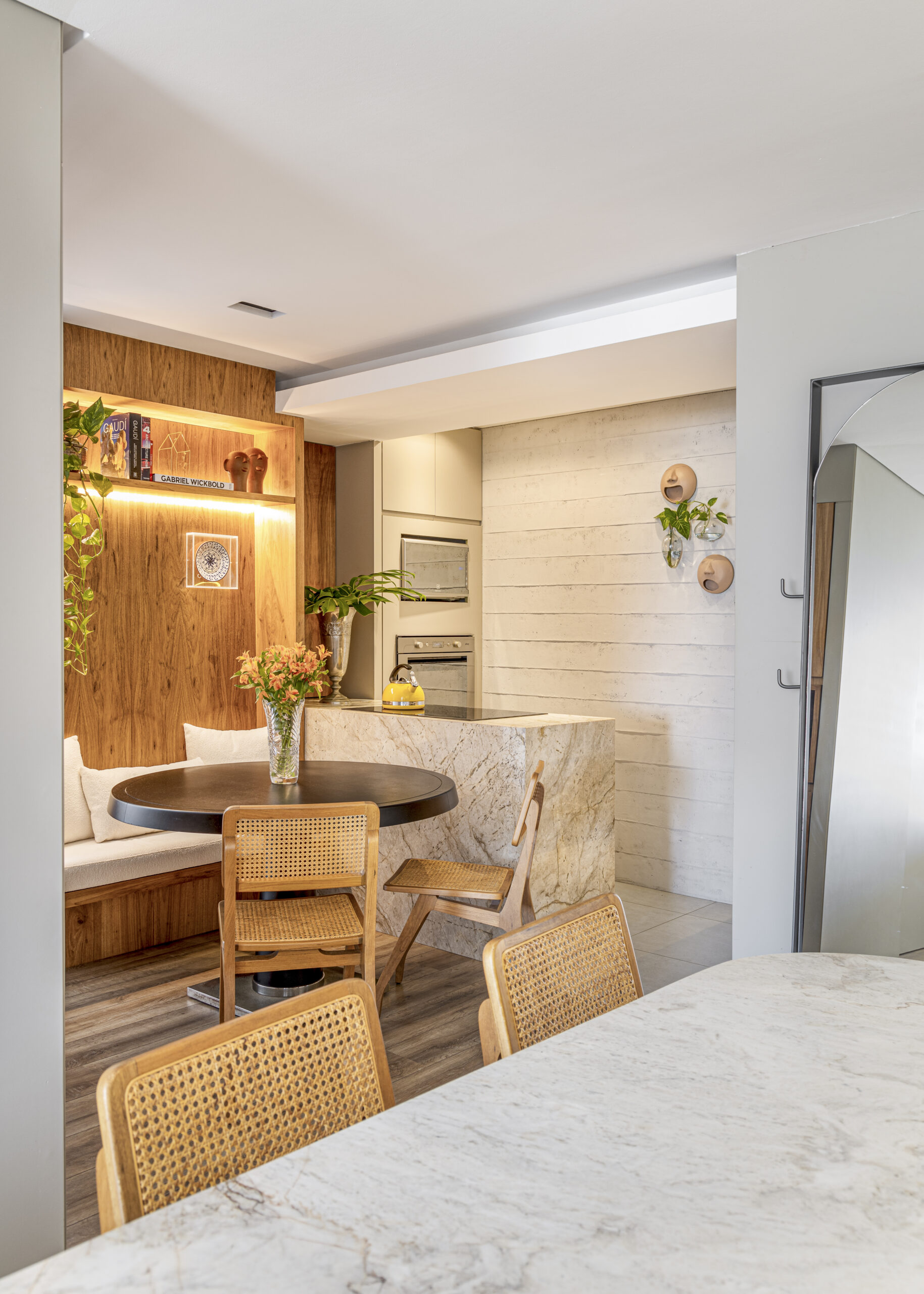A integração entre estar, jantar e cozinha cria uma dinâmica fluida, ampliada pelos tons naturais, pela madeira aquecida e pelo uso generoso das plantas, que trazem frescor e movimento ao ambiente. A bancada esculpida em pedra e o canto alemão reforçam a atmosfera descontraída, perfeita para receber amigos ou desfrutar da rotina a dois.