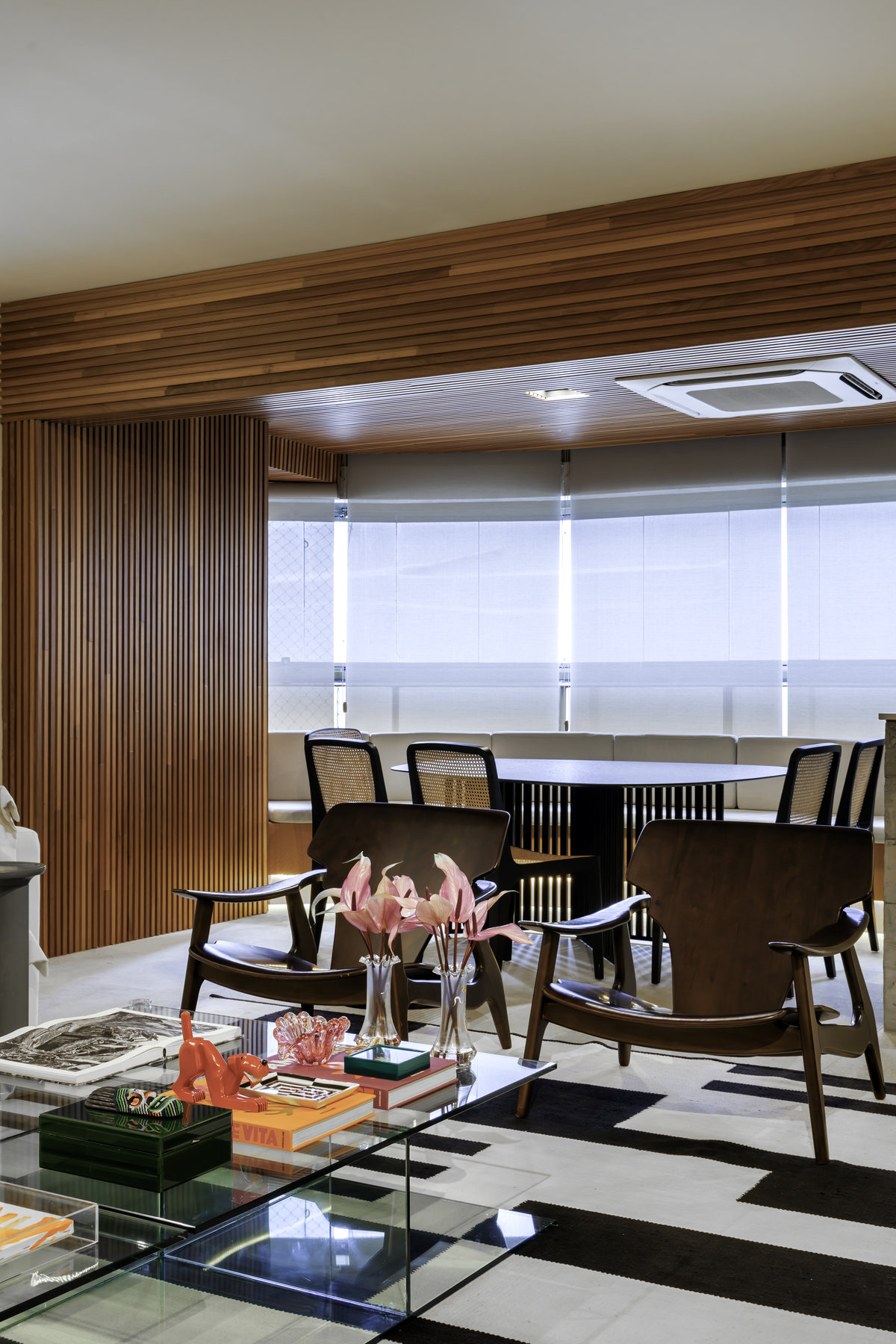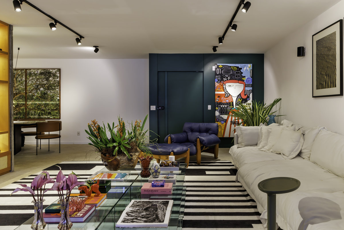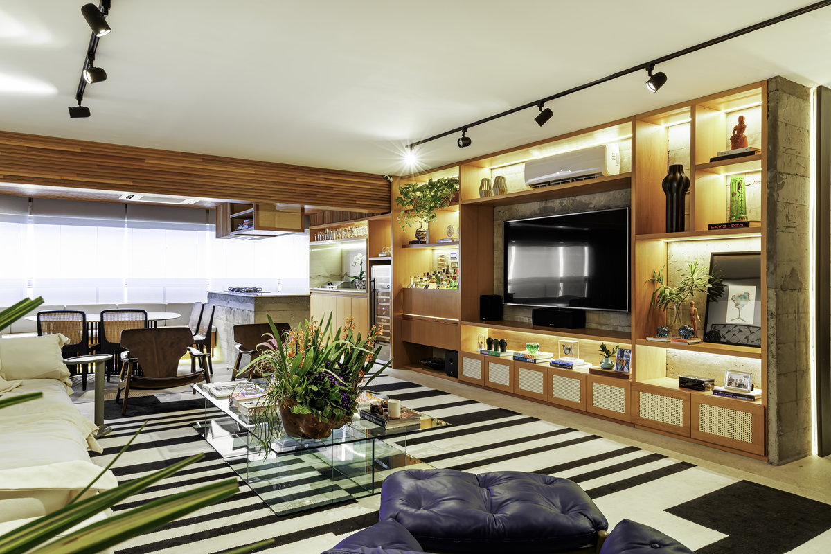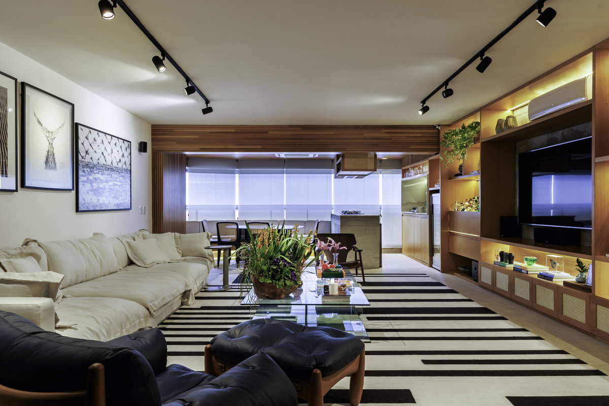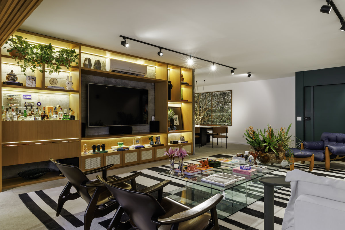 Destaque para a poltrona Mole, de Sergio Rodrigues, que dialoga com o espírito descontraído da sala de estar. O layout integrado favorece a convivência e a recepção de amigos, enquanto o bar em marcenaria iluminada reforça o convite ao encontro.