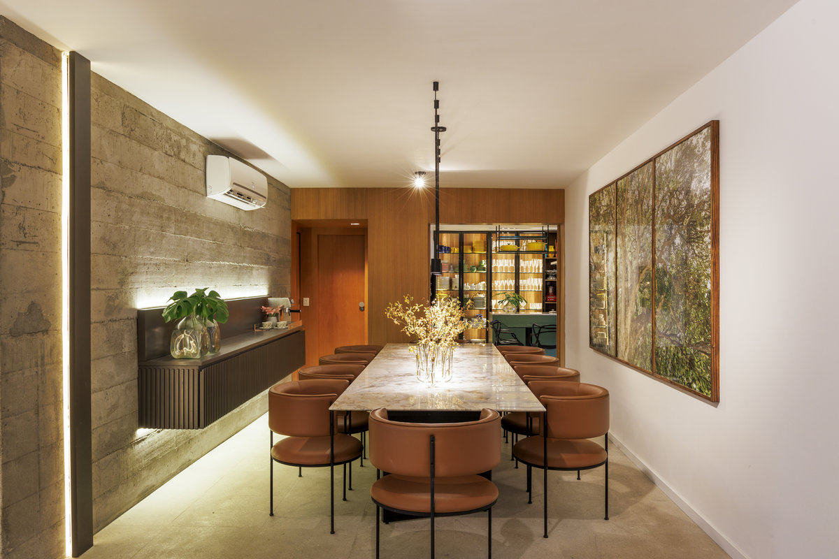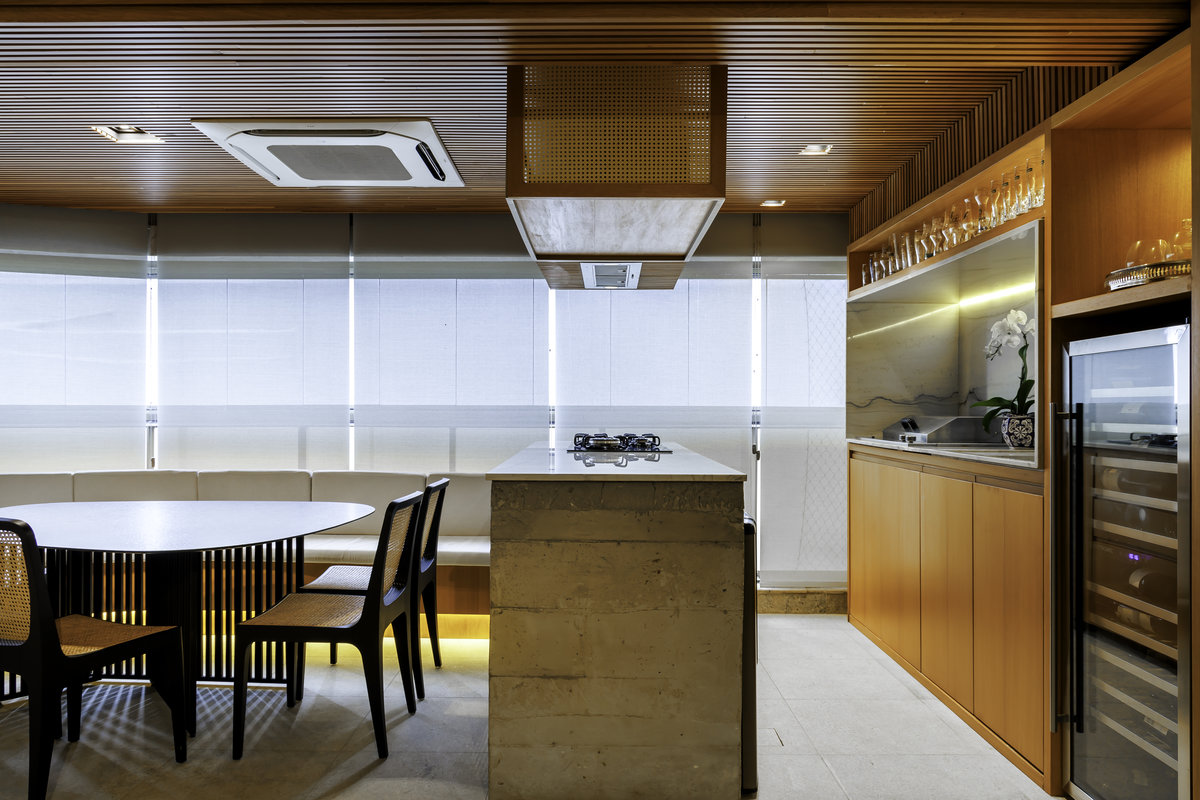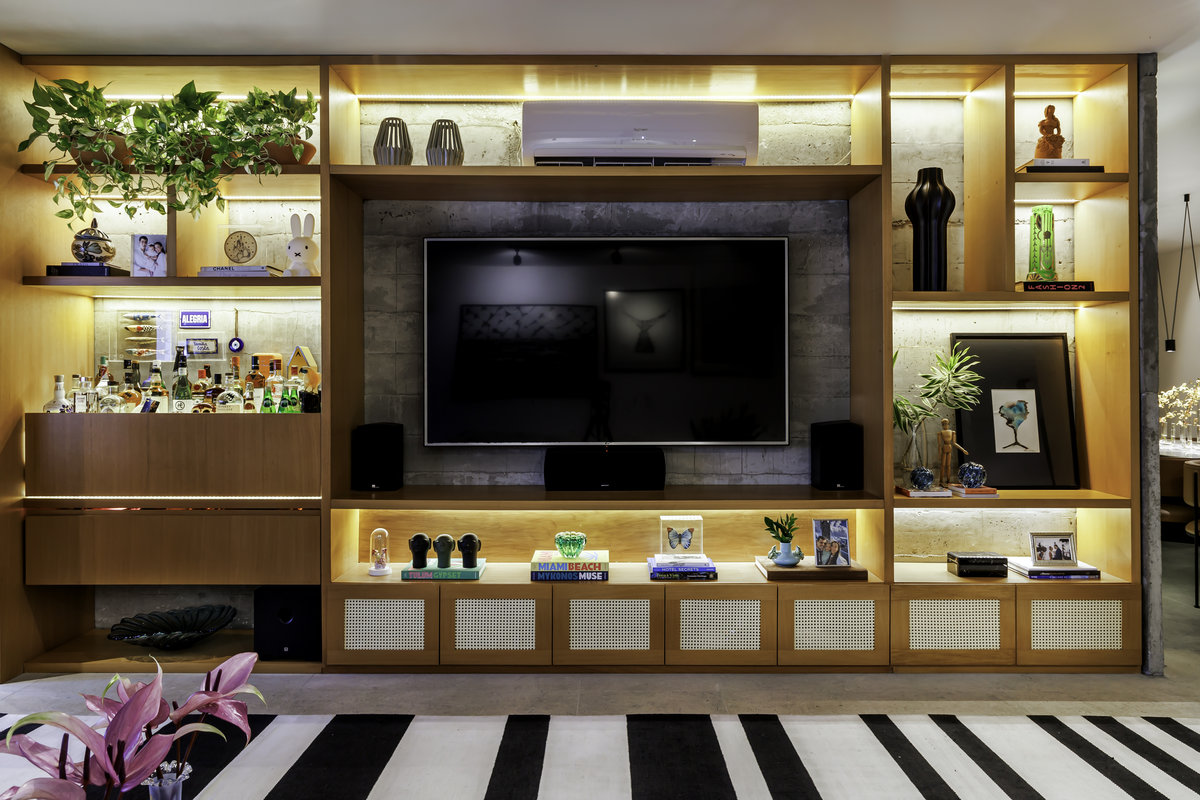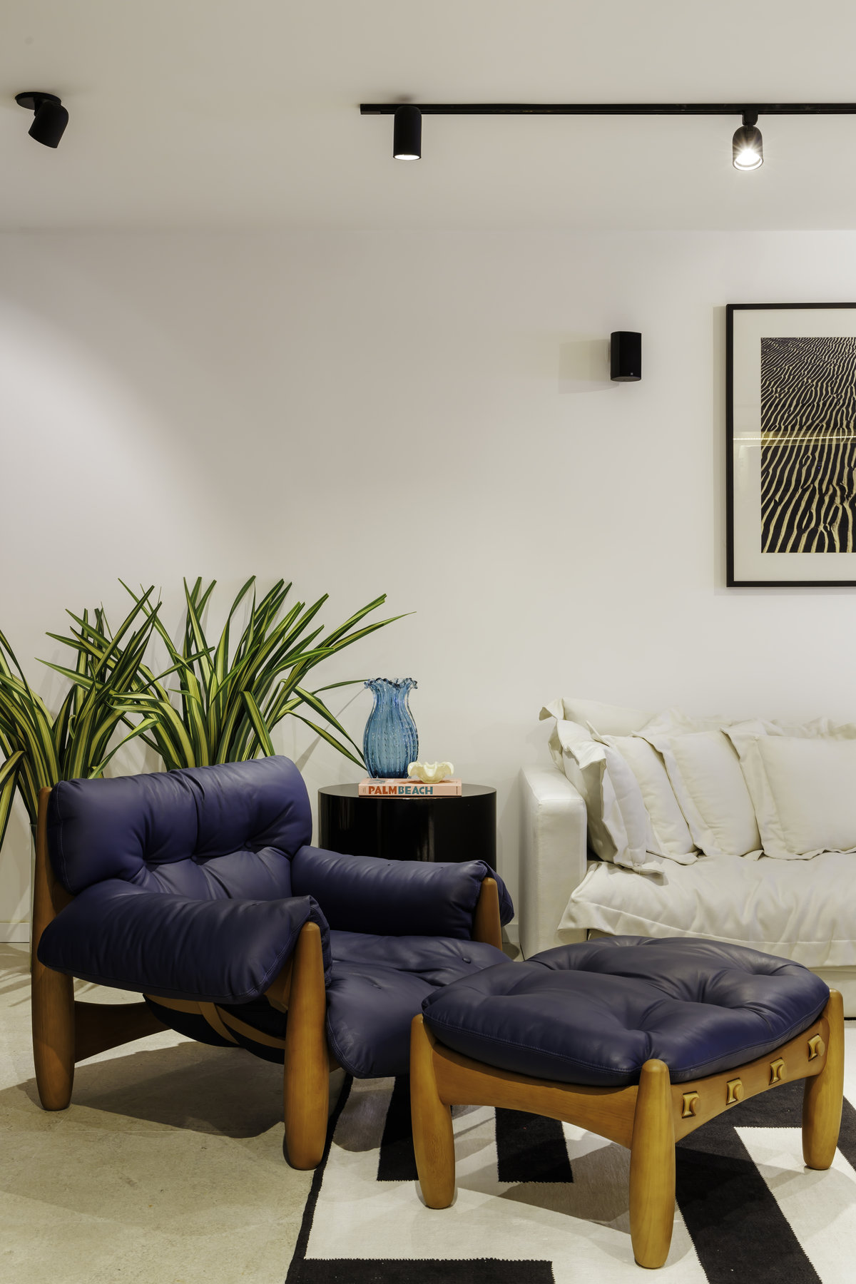 Destaque para a poltrona Mole, de Sergio Rodrigues, que dialoga com o espírito descontraído da sala de estar. O layout integrado favorece a convivência e a recepção de amigos, enquanto o bar em marcenaria iluminada reforça o convite ao encontro.