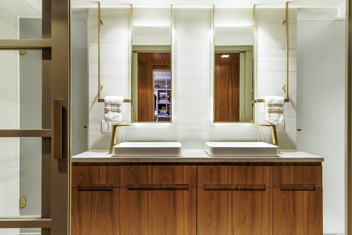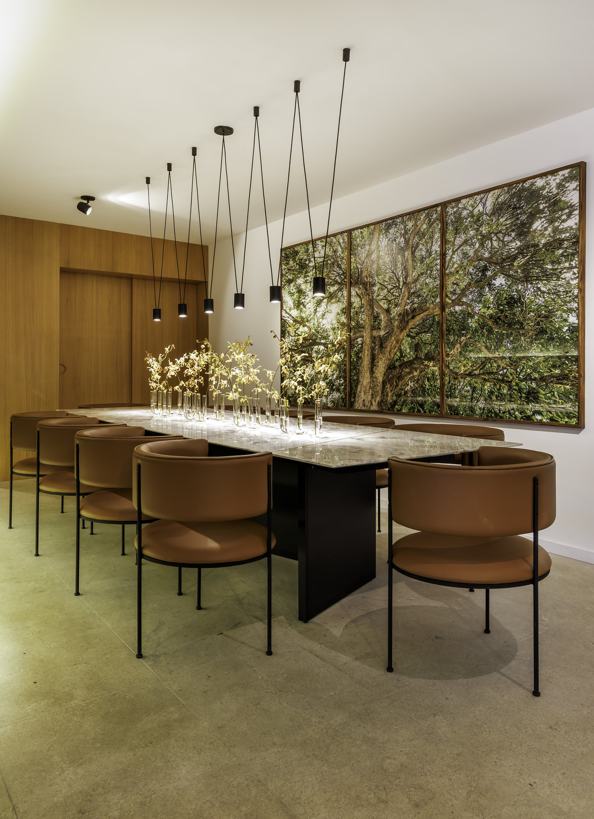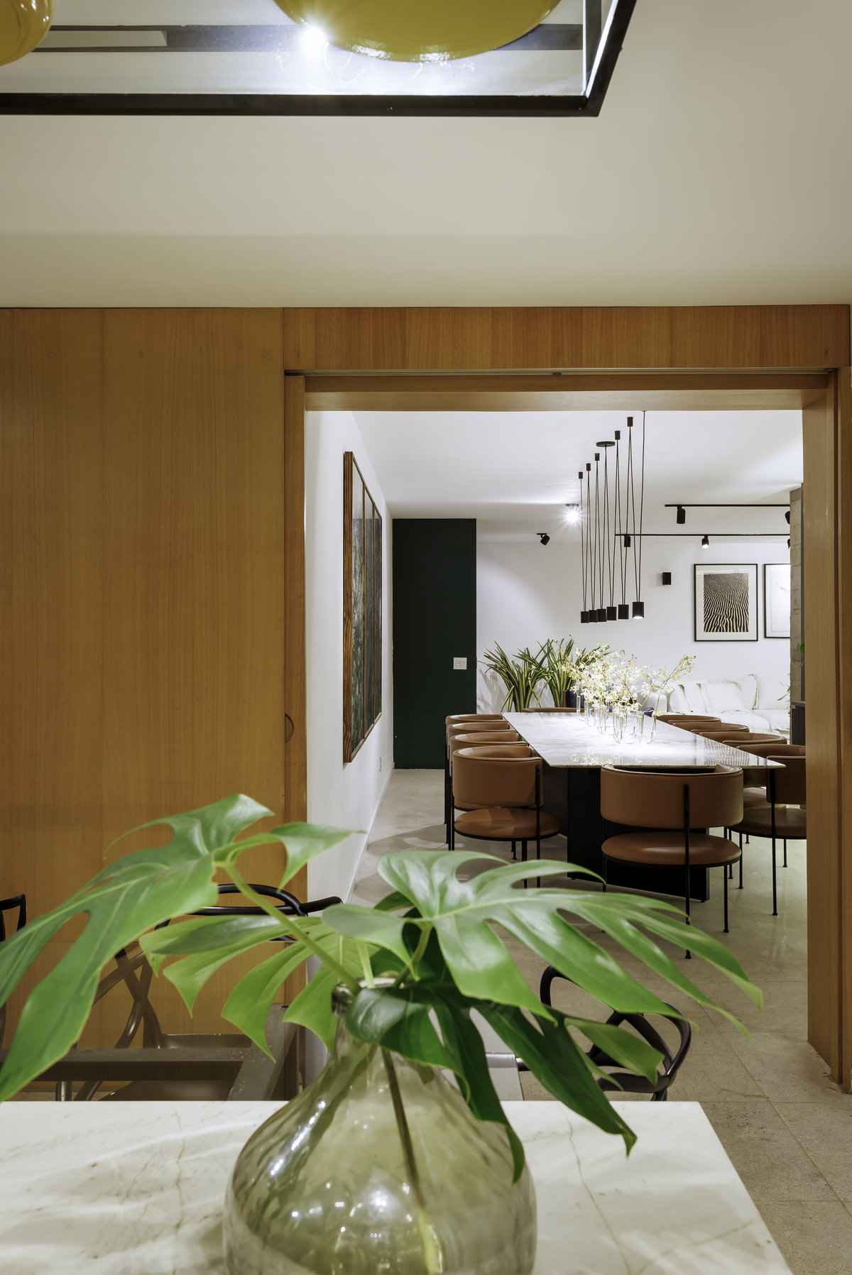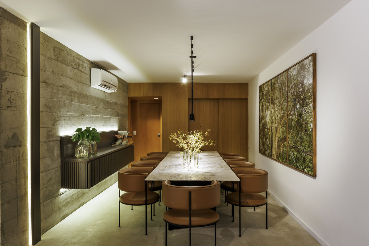 Destaque para a poltrona Mole, de Sergio Rodrigues, que dialoga com o espírito descontraído da sala de estar. O layout integrado favorece a convivência e a recepção de amigos, enquanto o bar em marcenaria iluminada reforça o convite ao encontro.