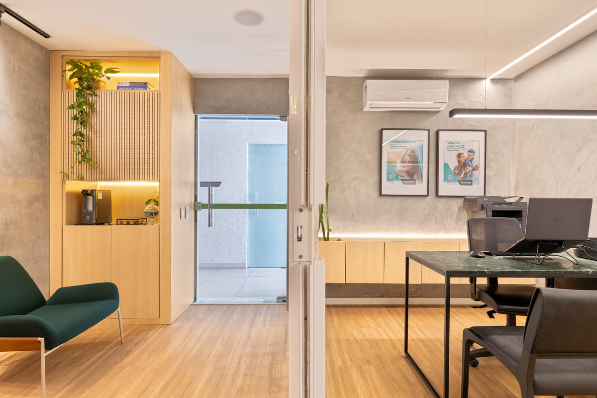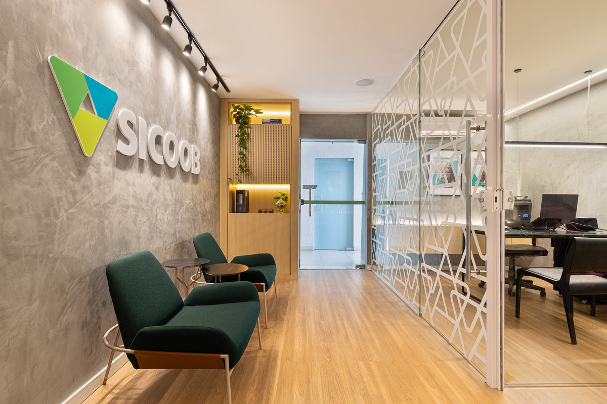 A paleta de materiais combina madeira, metalon e cimento queimado, equilibrando texturas quentes e contemporâneas. As cores institucionais do Sicoob aparecem de forma estratégica, reforçando a identidade da marca sem perder a sofisticação. Já a iluminação e o mobiliário foram escolhidos para criar um clima de confiança, com pontos de café e espera que tornam a experiência mais leve e acolhedora.