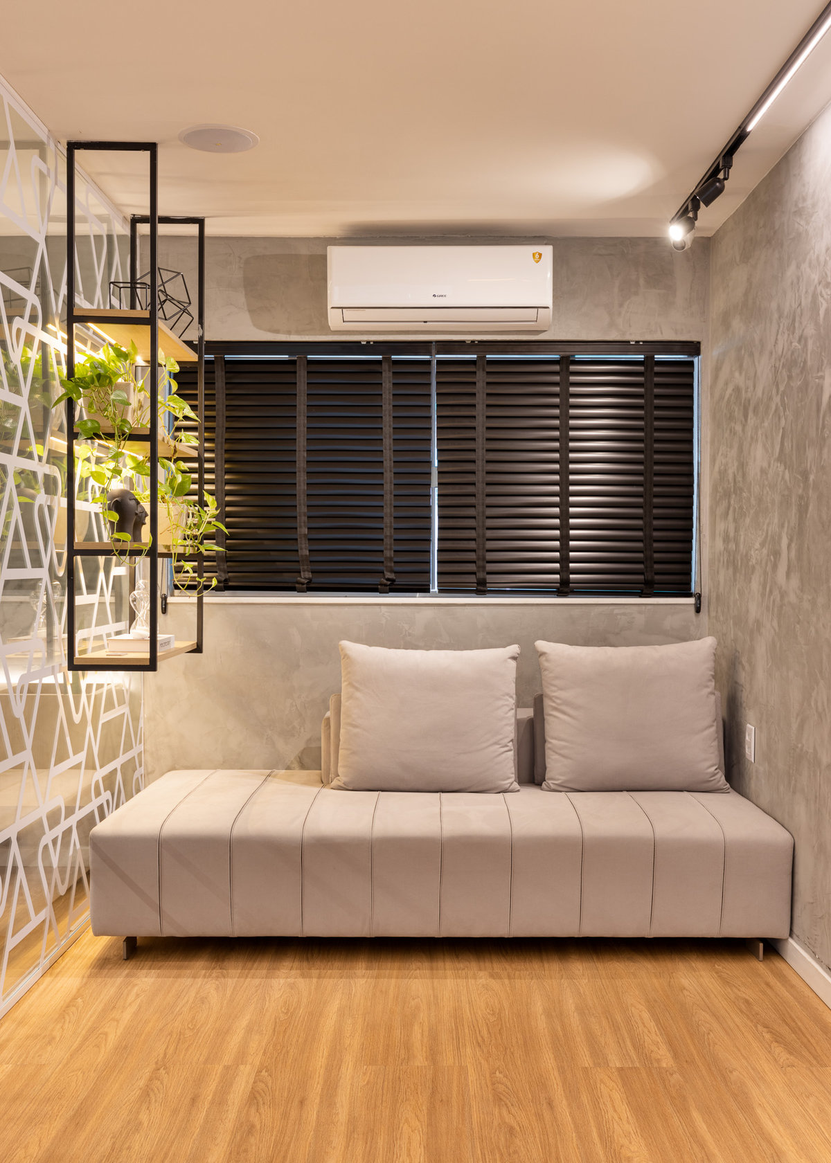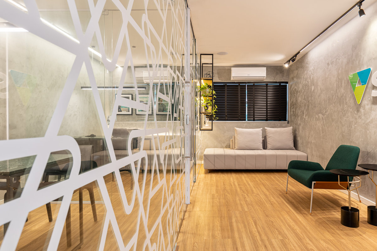 O layout foi desenhado para permitir integração total entre as duas salas de atendimento e a área de espera: bastam abrir as portas de vidro para que todo o espaço se conecte visualmente, trazendo amplitude e facilitando o fluxo entre clientes e equipe. Essa solução transforma o ambiente conforme a necessidade, mantendo sempre a sensação de transparência e dinamismo.